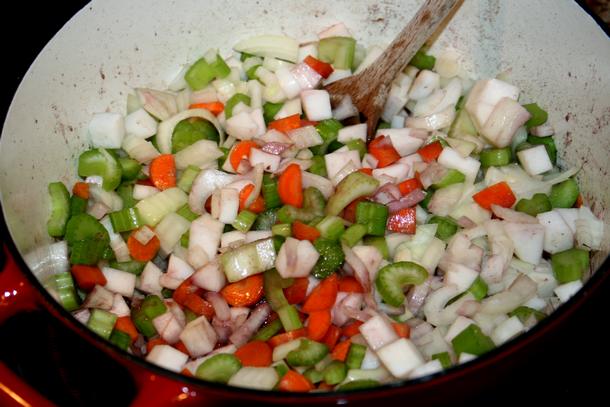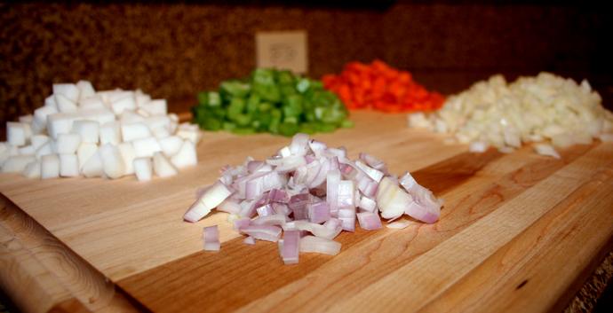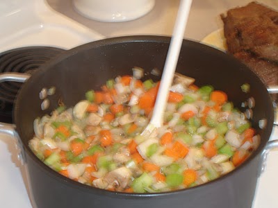 I decided to make this for New Year's Eve, because we were supposed to have company, and then the company canceled while it was in the oven. So, Mr. Fro and I gave it a taste test, and then put it in the fridge and warmed it up again the next day. It kept very well and might have been even tastier the next day.On to the photos! I didn't have sun dried tomatoes so I used a couple of scoops of tomato paste instead. I used half red onion and half yellow onion, because I wanted to use up the red onion. I also added mushrooms (again, wanted to use them up before they went slimey.) I also decided to make this in a roasting pan instead of my stainless steel pot, since I was making the full recipe and I was fairly certain, just looking at the ingredients, that it would not fit in my 6qt pot.  Everything all chopped up, and the meat floured. I really enjoy chopping. I'd enjoy being a vegetable-chopping sous chef: