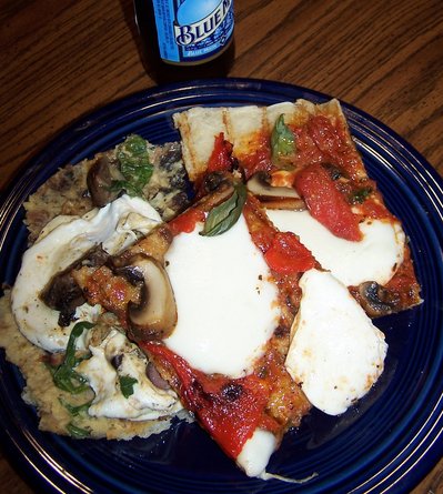 Flip onto a plate and add your toppings onto the grilled side. (somehow I didn't get the picture of the mediterranean toppings - it was hummus as the sauce, eggplant, spinach, kalamata olives, tomatoes, red pepper, mozzerella and feta) The one shown is marinara, mushrooms, fresh basil leaves, red pepper and mozzerella - and maybe a few other things.