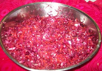 Method 1. Wash cabbages, slice into wedges and remove core. Wash carrots and cut into food processor manageable pieces. Wash radishes and beets, removed stems and annoying root tips at the base. 2. Shred cabbages and radishes with shredding or slicing disc or your food processor (I used shredding) and shred the beets and carrots. 3. Mix well in a large bowl and refrigerate. 4. Mix dressing ingredients together. 5. Drain vegetables and toss with dressing.*
