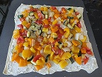 3. Unfold the pastry sheet on a lightly floured surface. Roll the sheet into a 13x11-inch rectangle. Place on the prepared sheet. Brush the edges of the rectangle with the egg mixture. Fold over the edges 1/2 inch on all sides, pressing firmly with a fork to form a rim. Prick the pastry thoroughly with a fork. Refrigerate while you prepare the veggies. The egg keeps it from drying out.