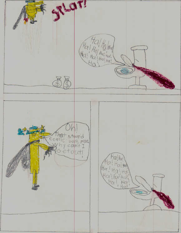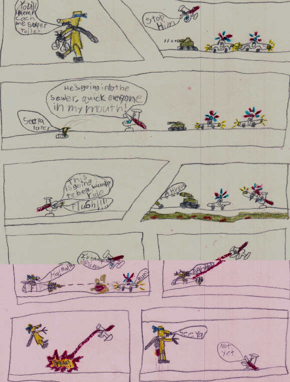 Brilliant! Loved it!I thought my kid was the only one who made her own comic books. Kilian, I loved your story, lots of action, the pictures are great! Also very funny. I loved the part where SuperToilet says. " he's going in the sewer, quick everyone in my mouth" *giggle* Thanks to the Wheezy Mom for posting this, I am going to share it with Katie tomorrow, I know she's enjoy it too.