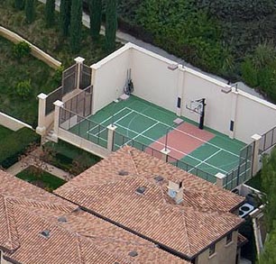 A reverse view of the house, as for that that brown spot, turns out it's a 2-in-1 court with a basketball hoop when the court isn't being used for tennis.