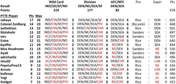 First, the results for the PTTE. The Seahawks were the NFC favorite with no one picking the Niners. AFC Championship picks were fairly evenly split 8 to 7 between the Broncos and Patriots, with those picking the Broncos moving up the PTTE ranks. The remaining Super Bowl picks are 5 to 3 in favor of the Broncos over the Seahawks.