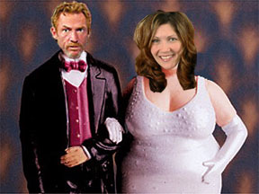 Dearly Beloved and oh so desperately Desperate Attention Whores:We are crowded here today to join these 5 couples in media wedlock. We agree to include one woman and her cutout, one woman and herself, one woman and her hamster, one woman and her hope, and Antonia, don't you be no fool, girlfriend - grab that man --- he's fine, he's an attorney, AND he has platinum cards in his pocket, baby! So, you go through the motions today - you don't wanna be married tomorrow? So you rip up the license...no biggie. Oh, DeBORah, you can sing when I'm all done officiating. I'm glad you found a man to replace your deeee-ud husband, Cardinale, because your 20 year old daughter does needs a daddy, uh-huh. Now get your foot off of his neck so he can repeat his vows.... By the way, you ladies look so beautiful. How you got all your fat into those gowns is impressive! So marriage is a wonderful thing...blah, blah, blah....the more you do it, the better you get at it....blah, blah, blah.....be authentic and live in the moment.....blah, blah, blah......ding dong your doorbell is ringing.....I'm a crazy b!tch from Brooklyn.....blah, blah, blah.....In the Yoruban tradition, we say, love is like a big flower, cause it smells nice - I'm big on smellin'....oh, gentlemen, some advice for you -- remember to always put the seat down - more marriages have been destroyed by women falling in the cold water when the lights are out in the middle of the night than I care to recall....and ladies, please, don't think your man wants to spend his free time watching your old episodes of Starting Over. Actually, it would be best for your marriages, and the rest of the world, if you would put Startin' Over behind you. Now - Dr. Vant To Look Jung, Lanre, Maury, Ken, David, Farrah, Mr. Twinkles, Rhonda, and by proxy, Danny and theInternet Man cut-out: do you promise to take these women and love them, honor them, indulge them, listen to them, support them, feed them, house them, clothe them, drive them around, make them feel like stars, and spend every free moment with them and them alone? Will you willingly go to Yoga classes, wellness seminars, marriage workshops, and engage in every other "movement of the moment" that they latch onto? And ladies -- Do you, Bridey, Niambi, Star, DeBORah, Maureen, Antonia, Jodi, Rhonda, Christie, and Lisa -- I cannot believe you all snagged someone -- do you promise to love these men until you don't feel like it anymore? Do you promise to spend their money on surgical nips and tucks that will make you feel better and more whole as women of the millenium? Will you continue to buy my books, tapes, and DVD's, as a gesture of good faith in the continued health of your wholeness? Will you promise not to become house-fraus, women in chains, bound to the monotony of domesticity and it's never ending......wait a minute...what the hell am I reading here? Oh, my - this is my "Life Coach graduation ceremony". (Shuffles through some pages) Aha, here we go...sorry 'bout that...I said I busy. Do you women really want to be married to these men? Will you live as women of honor? Will you admit that it is your fault if they cheat on you? Will you hold yourself responsible for all of their faults? If so, then you are ready to say "I do". Everyone together now {Everyone says in unison: "I DO!} Then by the power vested in me by the authority of the Yoruban tradition, Bumin-Murray Productions, and every god and goddess under the stars, I now pronounce you all, respective husbands and wives! Mazel Tov (that was for you, Jodi!) Let the party begin! Here comes Connie Chung....I'm history folks! Send my wedding fee to my agent at The Wm. Morris Agency -- yeah, I'm with them now. What a long, strange trip it's been, uh-huh! In another lifetime, my children, in another lifetime...Tata!