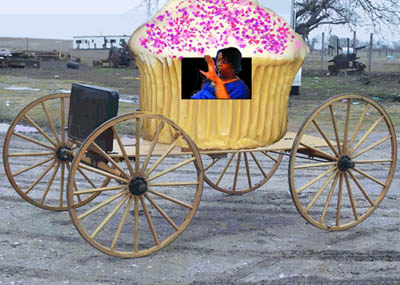 Uhhhhh, HI EVERYONE!! Just wanted to drop in and tell you all that I’m sorry I haven’t had time to uhhhh, you know, hang with all you C-list suckers! Uhhhh, don’t hate on me, but uhhhh, you know, now that I’ve emerged as THE STAR of Starting Over, big things are happening for me! Yeah, my career has really taken off since I got uhhhh, you know, a cyber-manager, Lucky Linda Slots! Uhhhh, yeah, she is on the job, and I’m gonna turn into Oprah anyday now. She is encouraging me to contine to uhhh, you know, DREAM BIG. For instance, this whole “Cocktails with Jill” thing…it’s not only gonna be uhhh, you know, just an internet thing. We’ll be taking it on the road in 2007! Yeah, just like my internet chats where you have to pay $5 to hear all the uhhhhhh, you know, entertaining, educational, and enlightening things I have to say! Except we’re gonna charge people $10 because of you know, all the expenses involved in the travel. Recently, Linda and I took our road show on a dry run through Oklahoma. Now, don’t get me wrong, for the love of Christmas, I still love my scooter, but Linda says I needed something a little fancier for public appearances. So, uhhhhhh, you know, let me proudly unveil the prototype of my latest ride. <<<in her best radio announcer voice>>> Ladies and gentlemen, may I present to you Jeeeeee-yulll Tracey’s CUPCAKEMOBILE!!! Here I am waving to all my fans in Oklahoma!