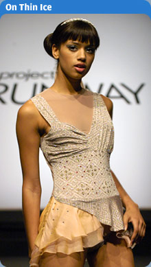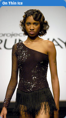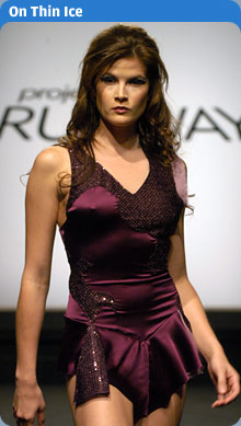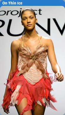 Soooooo happy about PR getting it's own forum!!! Now down to business...lol. As far as I was concerned this episode did not turn out any spectacular outfits. It seemed the designers were really challenged in this paticular area and had a hard time pulling it off. In their defense, it was out of their expertise and the material was hard to work with, never mind the machines giving difficulty, but I still was a bit disappointed with the outcome of the outfits.As for Santino, well I expected the outfit to be over the top and completely nowhere near what it should have been. I have to credit the guy for his creativity and desire to be different and give people something new instead of something blah and safe. Honestly, if he makes it as a famous designer woman will not be able to go to him and tell him what they want. Either you trust and like his designs or go elsewhere, but I admit I kind of like the rebel I won't conform to please you attitude, especially when he isn't getting all b!tchy with the judges, which was a refreshing part of last night. With that said it seems like Santino gets away with making outragious outfits and anyone else gets the Auf Wiedersan. Emmette, well honestly I know that his skirting should have been a bit longer, I don't think he intentionally made it "vulgar" if anyone even wants to go along with that. I do think his outfit was too dark, lacked creativity and was boring...same ol same ol. Honestly, I wasn't sad to see him go, I mean he's not a bad or dislikable guy but I do think his design's were dull and I was tired of hearing "I'm so used to designing men's ware". Yes, Yes Emmette we know you only say it like every episode, enough excuses, know your weakness and strenghts and get on with it please!!!!! Daniel, Andrea and Nick well it wasn't completely horrid or completely great, so they deserved to pass through to the next round just not to be considered the best. I did think Nick's outfit looked better on t.v. I don't know if it was the lighting on stage or my room but it didn't look that bad as it does in that pic. Kara's outfit wasn't horrible, the fringe came off as sloppy and the outfit was a non original creation, I think if she jazzed it up a bit she could have had potential. Chloe's dress was a pretty color, but honestly I agree with her on it looking like a Christmas tree. No shape at all, she should have spent more time thinking on shaping with that type of design. Maybe if it was going to be worn during a Christmas special then it would have been good. Zulema's outfit was pretty, but I honestly thought the judges were going to think it was too revealing. That's what I didn't get last night, Emmette's outfit was vulgar and Zulema who exposed more was the winner. I think the bust was a little low but other than that she really did do a good job and captured the concept of the challenge at hand and gave it her own twist. She worked it out. Overall, the turn out for this episodes outfits was my least favorite, but I did enjoy seeing them all have fun and goof off wearing their skating outfits and trying to skate. Santino became a little more likable with last night's episode and cracked jokes and just had fun.