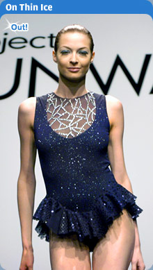 LAST EDITED ON 01-19-06 AT 00:31 AM (EST)Our very one Project Runway forum...wooooo hoooo! Thanks so much to the powers that be! This week the designers are forced to wear cheesy costumes in order to discover the next challenge. According to Tim Gunn’s podcast, they had to wait for production to set up at the ice rink so the Project Runway van went to the parking lot of a nearby prison. So Tim decides to mess with the designers and told them that they were the entertainment for the inmates. After much freaking out, they head over to the ice rink where they meet Sasha Cohen who tells them their next challenge is to create a skating costume for her which she will wear at an exhibition. With half of the original designers gone, it’s really getting competitive now. Here’s what the designers came up with: Zulema: Winner