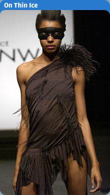 Our very one Project Runway forum...wooooo hoooo! Thanks so much to the powers that be!You know it! How very cool. I agree on Zulema. With some tailoring, it would/could be stunning. I agree on Santino. Booo-hissss. He was obviously cast because they wanted a melodramatic evil-guy. Hopefully, the train runs over him. It will happen, but it just want it to happen sooner. I agree on nick. Not quite sure what he was envisioning. Luckily it wasn't Final 5 or so. I also agree on Kara. I've seen her dress on skaters back when IceCapades was big. For the yungun's, that's like the 1970's. Poor misunderstood Emmett. All lurch-like in composure. It was funny seeing the pink stretchy number he had to wear during the episode. It really brought out his bitter-queen side. Oh and the dress? Ummm...Skating Outfit? My great grandma hasn't seen an outfit like that since the EyceKapaides was big. For everyone living, that's like the 1870's. Daniel. Hmmm... All I can think of is boring. However, when I look at the model, I can't help myself from thinking... SHE.IS.A.MAN.! No. I mean it...look at her hands. Chloe. Best dress. Mind you it could still use some tailoring, but frankly, my favorite this week. Hahaha. Andrae. Hahahhaaaaa.... Ahem, sorry. I just can't help myself. Just thinking about this guy makes me harken back to a tortured-hamster song someone once told me and in the uncomfortness I laugh. But, Princess Cyclone (Which is what I'll name him), was again sub-par this week. I mean his design was sub-par. Like on the ParisHiltonian-level. Easily ripped to shreads before filming. (Side note on PrincessCyclone, he gets marks for fixing the machines, but also gets marks against for being so bitchy afterwards.) Special prizes The "Whaasssdat?": Given to designs that are both unflattering and unmarketable. (Except for DragQueens) Daniel: